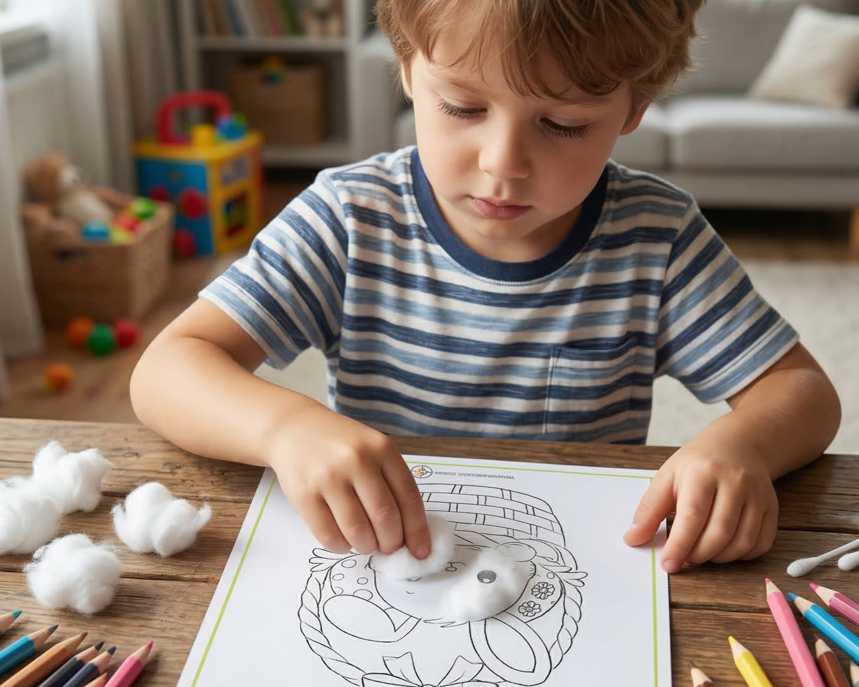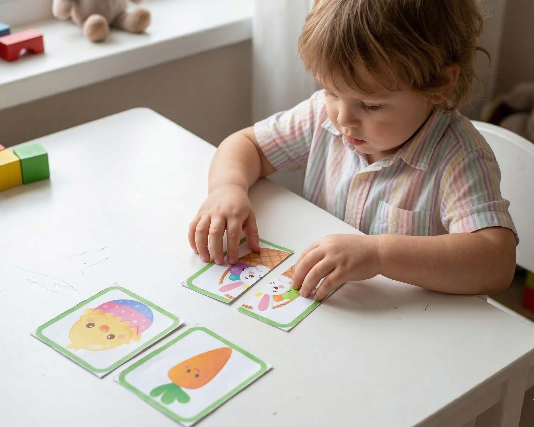 3. 🧩 Kit Lógica e Coordenação Motora: Jogos da memória, alinhavos, caça aos ovos e percursos que trabalham o desenvolvimento cognitivo real.